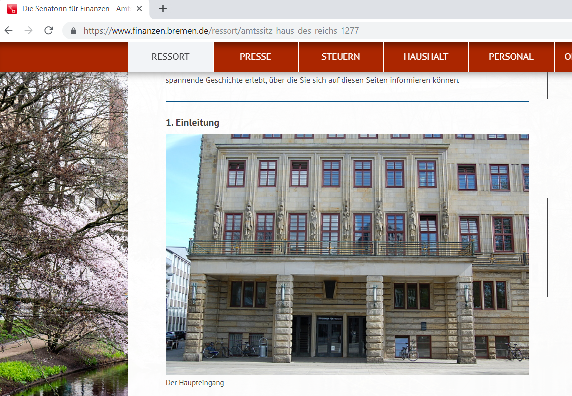 Nach dem Konkurs des Unternehmers 1934 übernahmen die Nationalsozialisten das Gebäude in der Regie des Reichsfinanzministeriums und benannten es in „Haus des Reichs“ um. Noch heute sind in dem Gebäude das Finanzamt und die Senatorin für Finanzen untergebracht. Seine kunstvolle Innenausstattung mit Dekor und Ornamenten des Art déco steht im Gegensatz zu dem fast gleichzeitig erbauten klobigen Treppenhaus des Siegener Finanzamtes. Sicherlich gab es in der Provinz eine andere Haltung zu Architektur und Bau-Ornamentik als in der Großstadt und in der Konkurrenz der fürstlich agierenden Kaufleute. Wollte man in der Provinz einen eigenen Stil kreieren?