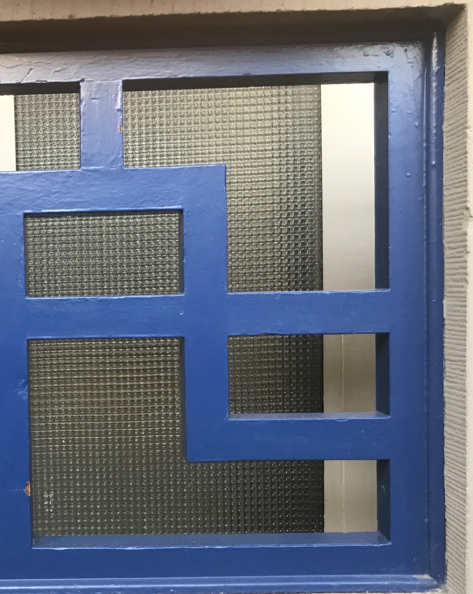 Die Eisenkonstruktion im zweiten Treppenhaus (Altbau) nimmt das Muster der Kellerfenster auf, die außen im Grundmauerwerk zu sehen sind.